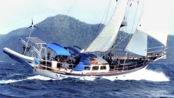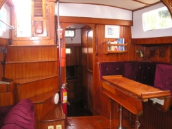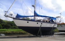 She is a boat built for long distance cruising. That means comfort, safety and storage come above speed, number of bunks and manouverability. Her hull is 13 tonnes of inch thick glassfibre, and the hull type is known as a long keel (the bottom of the hull runs to the back in one unbroken sweep) double ender (the stern is pointed, as well as the bows)