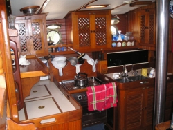 Next is the kitchen (galley) which is pretty large for a boat, with deep sinks, hot and cold fresh water and a salt water spray to save our supplies of drinking water. A two burner stove and oven is used to cook our meals, and we have a big fridge and cool box, but no freezer.