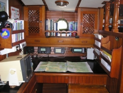 Opposite the galley is the chart table, where the main instruments, radios and other systems are housed, as well as our paper maps (charts) and navigational books. Also here is the all important CD player and our music collection!
